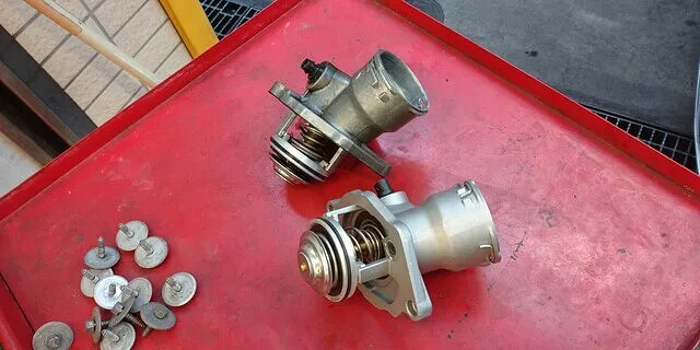 エンジンとラジエーターホースの付け根にあるサーモスタット。エンジン冷却水の温度管理を行うバルブとなります。サーモスタットを交換し、作業完了となりました。